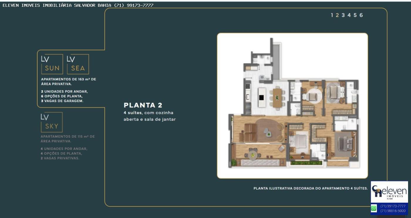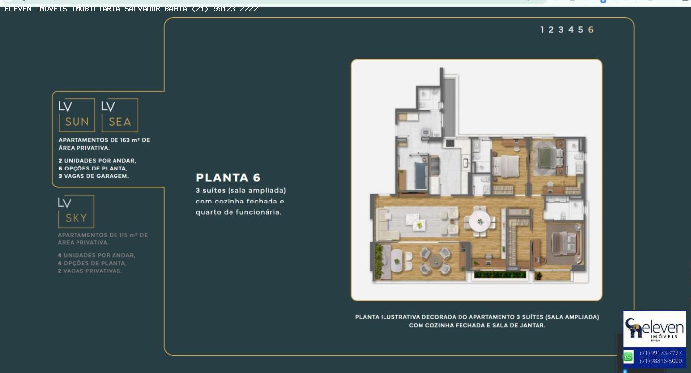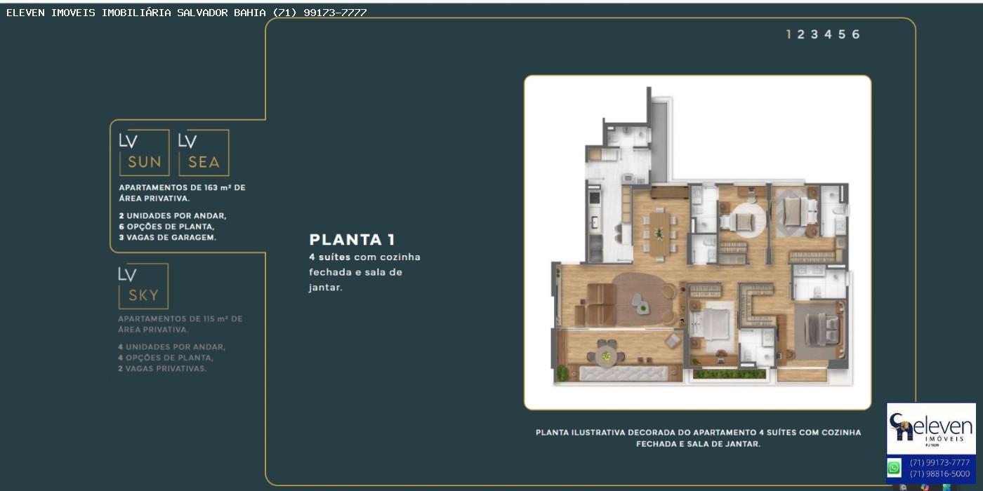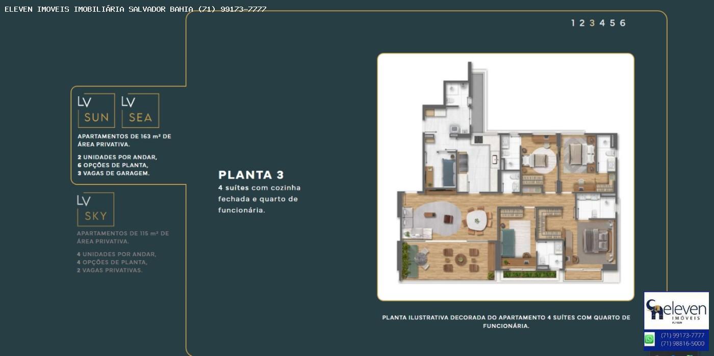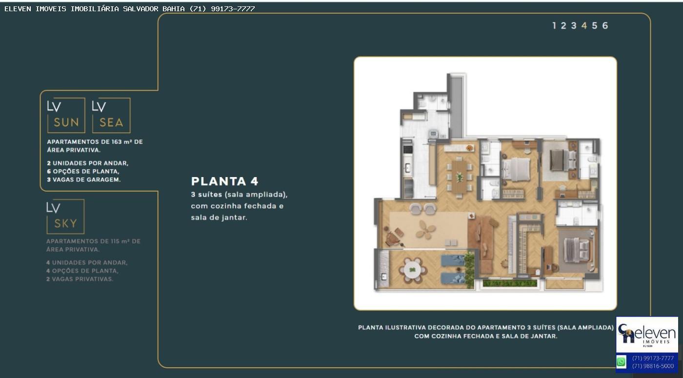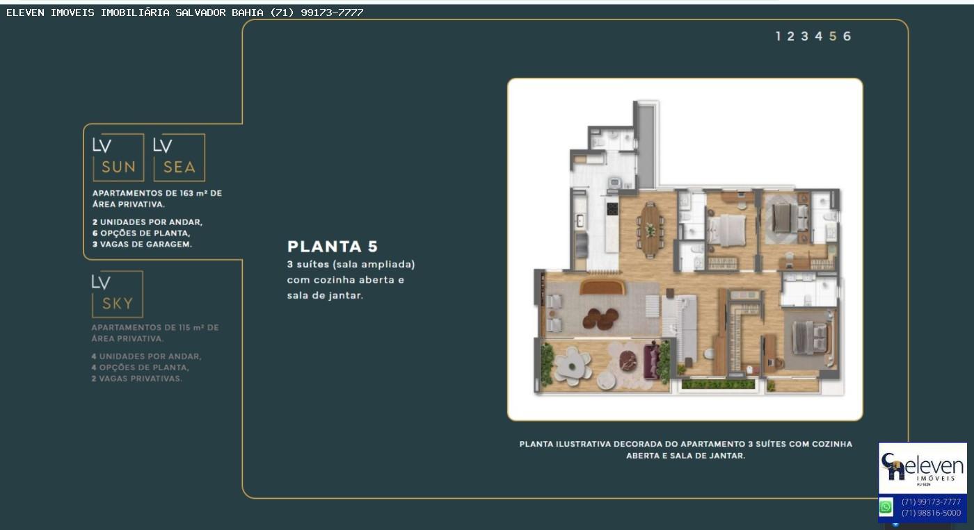 LV Living: Área residencial com 3 torres, sendo duas com apartamentos de 4 suítes e uma com unidades de 3 suítes. A infraestrutura contempla áreas de lazer completas e rooftop com piscinas voltadas para a Baía de Todos-os-Santos.