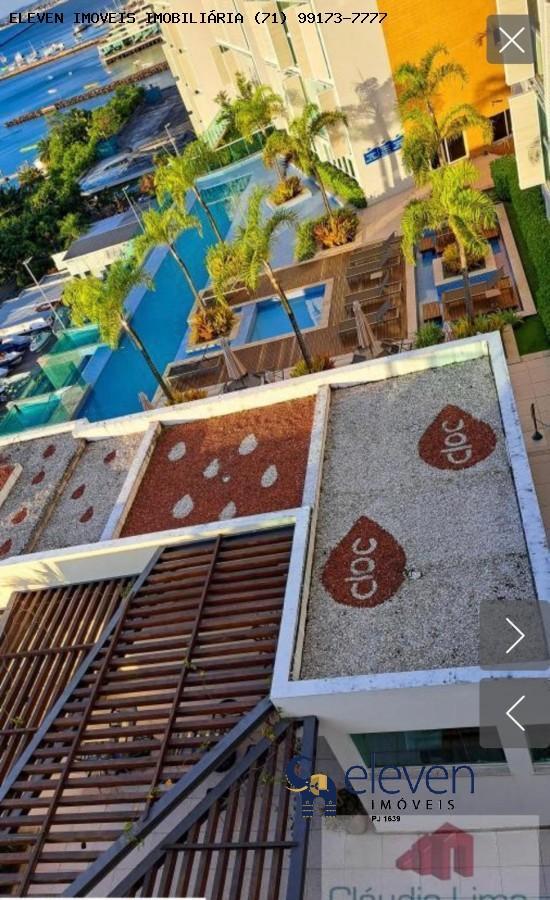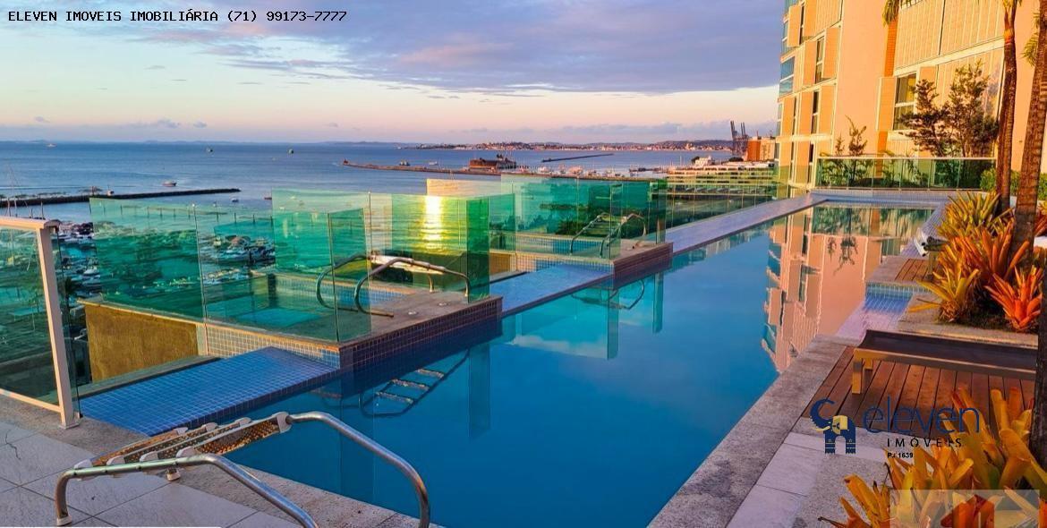 O condomínio conta com uma piscina de borda infinita com vista panorâmica para a Baía de Todos-os-Santos, deck molhado e solarium para relaxamento.