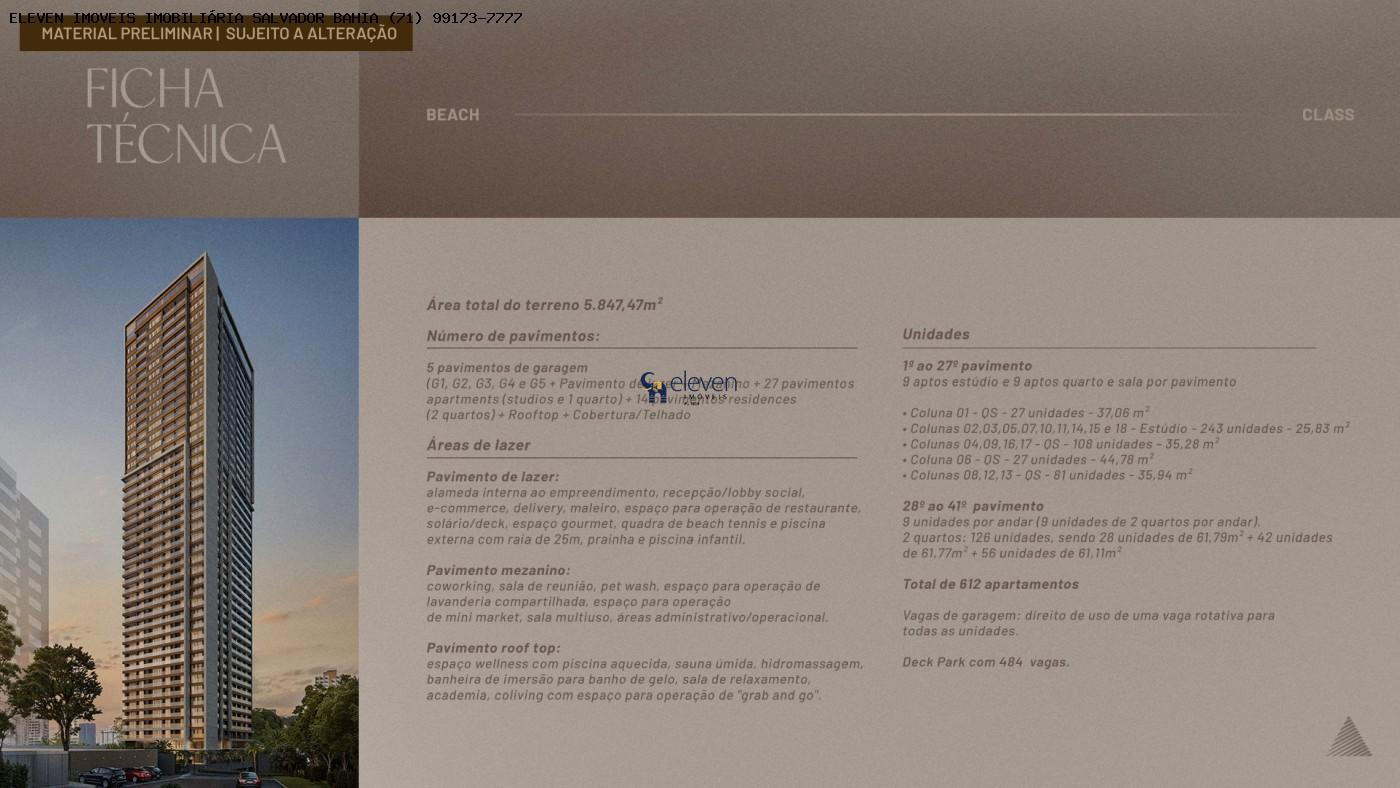A Eleven Imóveis apresenta oportunidade de investimento no Beach Class Bahia. Projeto estratégico para alta rentabilidade via aluguel por temporada ou moradia, com infraestrutura completa de lazer e serviços nas proximidades.