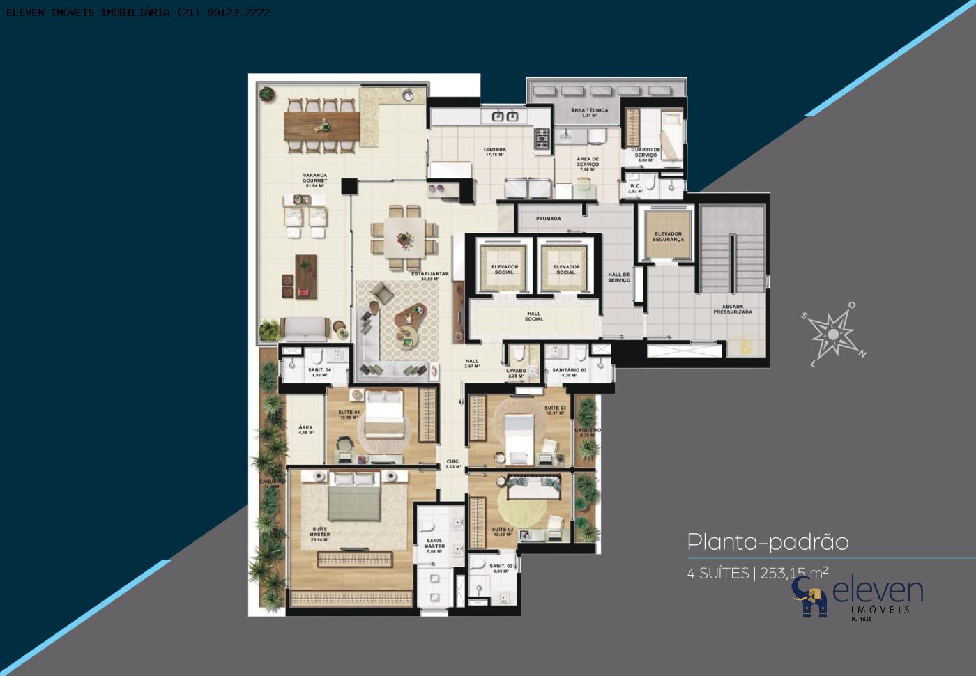 O apartamento possui uma planta padrão de 4 suítes com generosos 253,15 m² de área privativa. A exclusividade é absoluta, sendo apenas 1 apartamento por andar, o que garante total privacidade aos moradores.