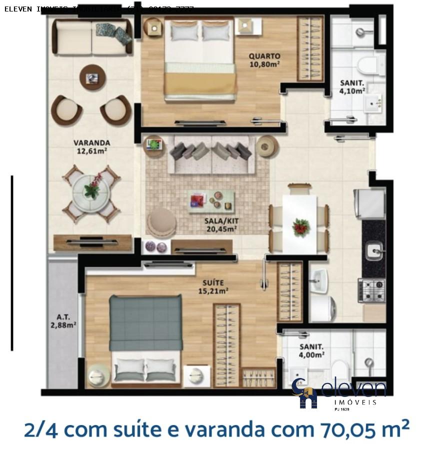 O imóvel dispõe de 2 quartos, sendo 1 suíte master, varanda integrada e o diferencial exclusivo de possuir 2 vagas de garagem soltas e independentes.